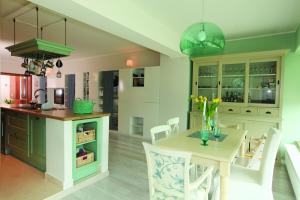 Biblioteca amenajată pe tot peretele are rol de depozitare şi în zona de bucătărie, unde rafturile au fost complet închise. Deoarece spaţiul ce revenea efectiv ariei de bucătărie nu era prea mare, o parte dintre electrocasnice şi chiuveta au fost încastrate în insulă. În acest scop, au fost mutate şi instalaţiile. Acestea au fost mascate într-un podium special creat, placat cu calcar şlefuit, care delimitează funcţiunile. Mobilierul de bucătărie a fost conceput de Cecilia Cărbunaru, iar blaturile din lemn au fost realizate la comandă de Natural Wood Floor.